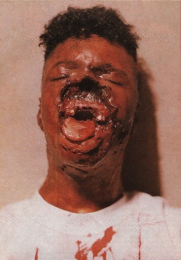 skin covers his face. Seared strips of flesh hang down from his cheeks